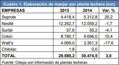 Según un estudio publicado por un diario chileno, la multinacional suiza Nestlé lidera la producción de manjar con poco más de 12 mil toneladas, seguido por Colún con casi 10 mil toneladas anuales y en un lejano tercer lugar Soprole, con poco más de 5 mil toneladas de producción anual.